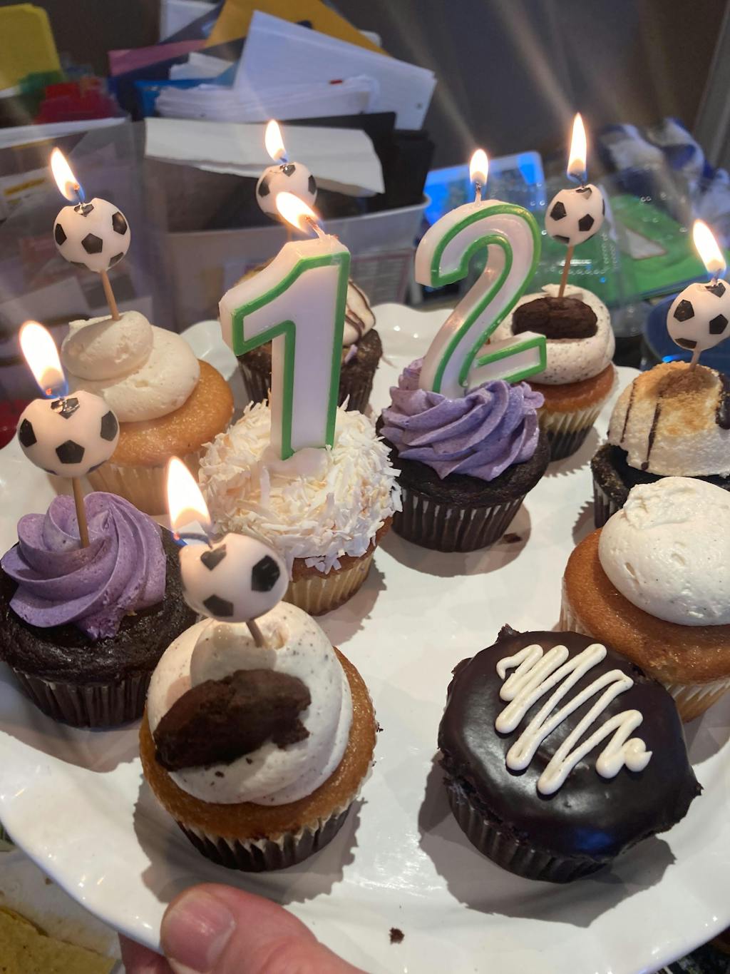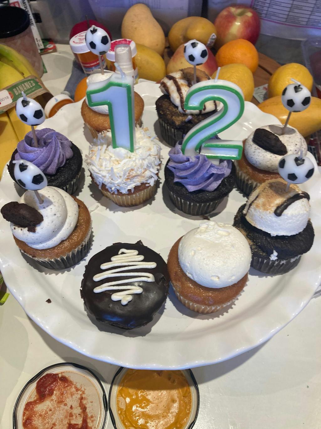 Chocolate Cupcake, Lavender Icing: Sugars (Organic cane sugar, Organic icing sugar {Organic cane sugar, Organic tapioca starch}, Organic tapioca syrup), Organic soy beverage, Organic unbleached wheat flour, Filtered water, Vegan buttery spread (Sustainable palm oil, Filtered water, Non-GMO canola oil, Non-GMO canola lecithin, Natural flavour, Vitamin A palmitate, Vitamin D2, Annatto, Turmeric), Organic sustainable palm fruit oil, Tofu, Sunflower oil, Cocoa, Dairy-free chocolate (Organic cane sugar, Unsweetened chocolate, Cocoa butter, Soy lecithin, Vanilla bean seeds), Plant-derived colour (Sunflower oil, Beet juice, Spirulina extract), Apple cider vinegar, Organic rice beverage, Baking soda, Vanilla bean paste, Coffee, Sea salt, Non-alum baking powder, Organic dried lavender. CONTAINS: SOY, WHEAT